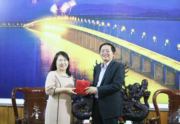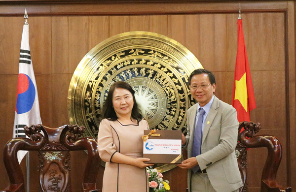 Đ/c Nguyễn Văn Dũng - Bí thư Thành ủy Quy Nhơn trao tặng quà lưu niệm cho bà Kim Sun Su - Quận phó Quận Yongsan
